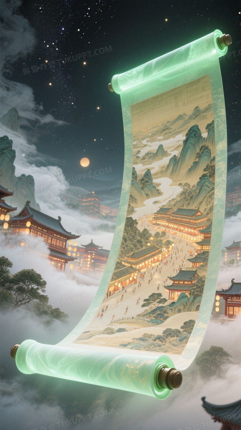 本作品内容为巨大半开半卷的浅绿色发光透光烟纱卷轴悬浮在空中, 格式为 jpg, 大小1 MB, 图片尺寸为936 x 1664, 源文件无水印, 欢迎使用熊猫办公。 如认为平台内容涉嫌侵权,可通过邮件:tousu@tukuppt.com提出书面通知,我们将及时处理。