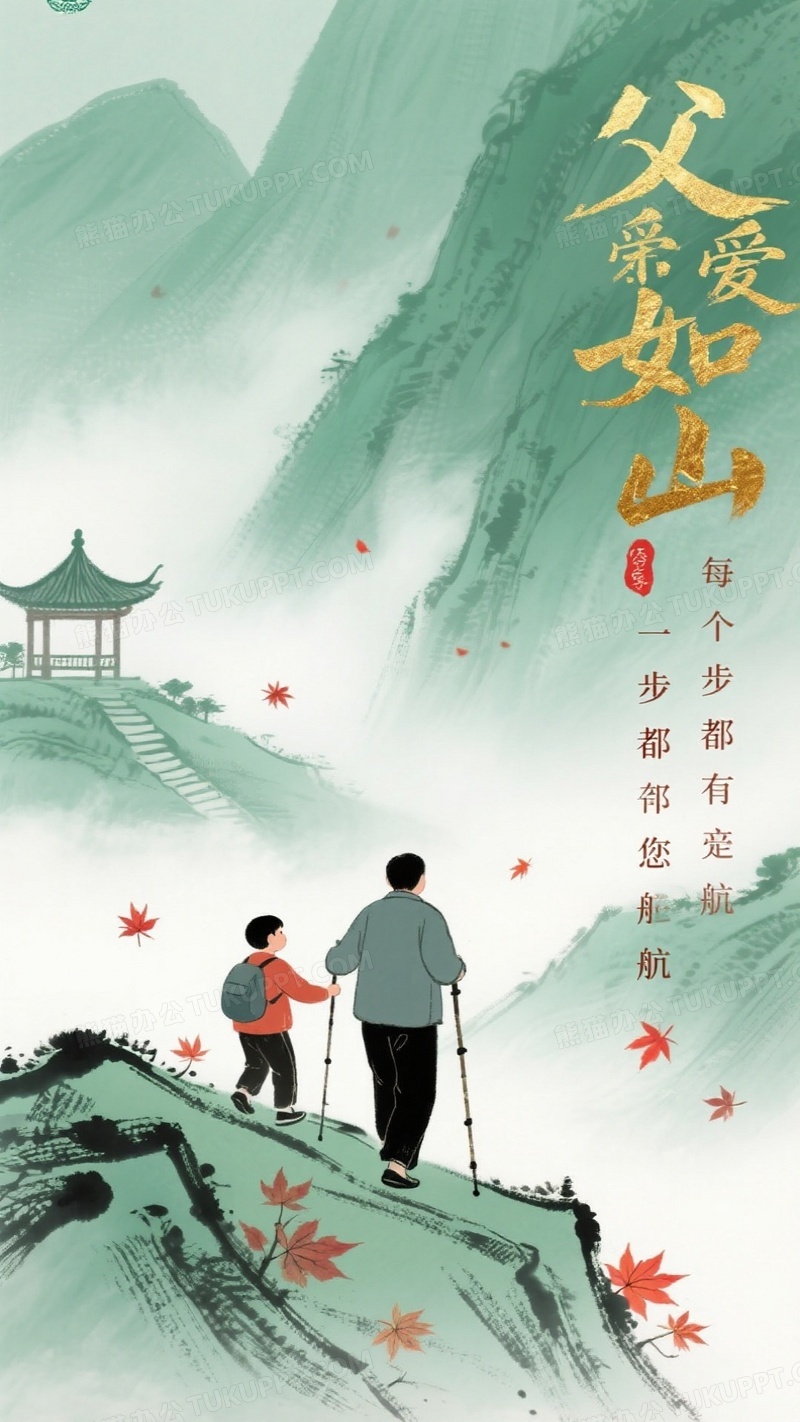 本作品内容为国风水墨父子登山画面, 格式为 jpg, 大小1 MB, 图片尺寸为936 x 1664, 源文件无水印, 欢迎使用熊猫办公。 如认为平台内容涉嫌侵权,可通过邮件:tousu@tukuppt.com提出书面通知,我们将及时处理。
