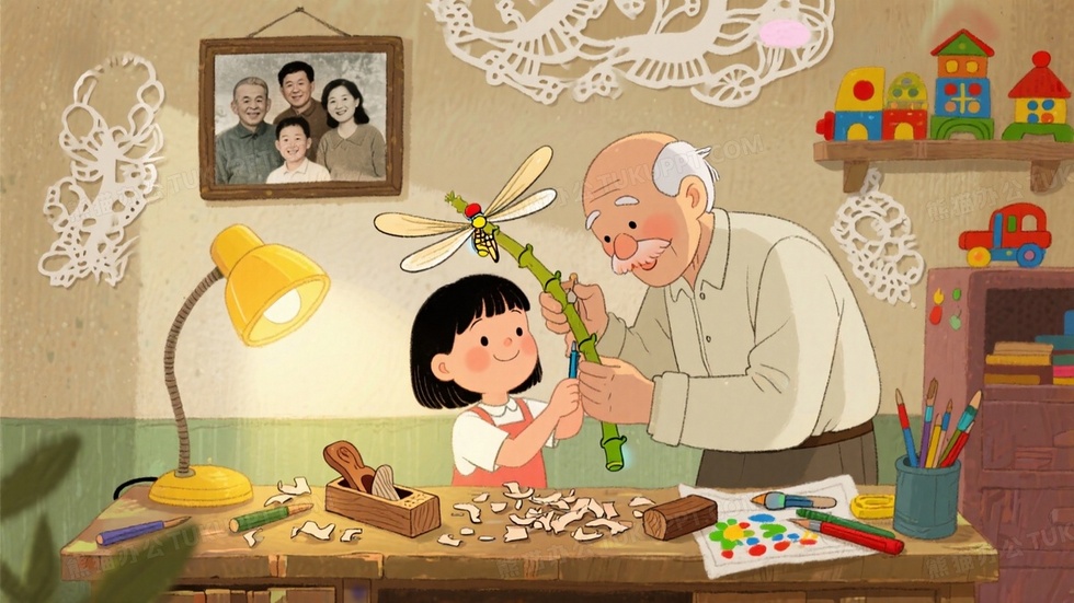 怀旧风格手绘场景祖父帮孙女修理竹蜻蜓