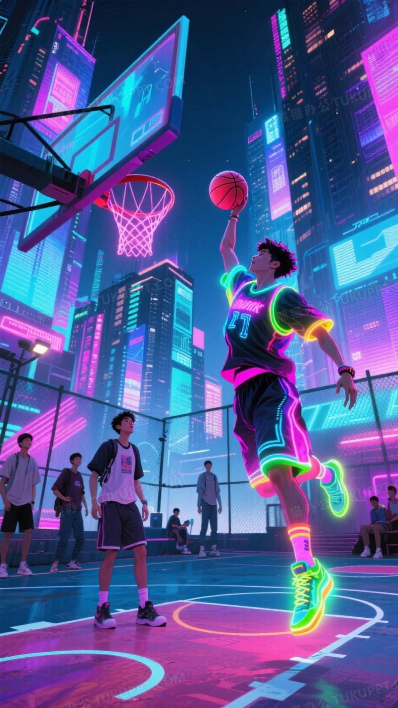 本作品内容为赛博朋克风格场景大学生在霓虹灯闪烁的街头篮球场扣篮, 格式为 jpg, 大小1 MB, 图片尺寸为936 x 1664, 源文件无水印, 欢迎使用熊猫办公。 如认为平台内容涉嫌侵权,可通过邮件:tousu@tukuppt.com提出书面通知,我们将及时处理。