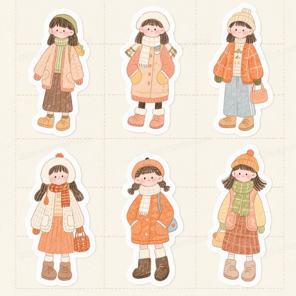 本作品内容为一组手帐素材可爱女孩冬季日常穿搭, 格式为 jpg, 大小1 MB, 图片尺寸为1328 x 1328, 源文件无水印, 欢迎使用熊猫办公。 如认为平台内容涉嫌侵权,可通过邮件:tousu@tukuppt.com提出书面通知,我们将及时处理。