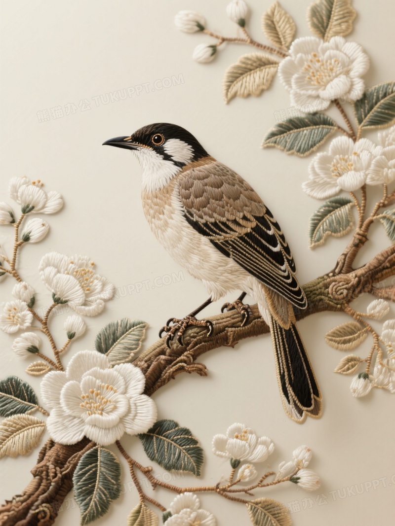 本作品内容为一只鸟栖息在树枝上周围是精致的白色花朵和叶子, 格式为 jpg, 大小1 MB, 图片尺寸为1104 x 1472, 源文件无水印, 欢迎使用熊猫办公。 如认为平台内容涉嫌侵权,可通过邮件:tousu@tukuppt.com提出书面通知,我们将及时处理。