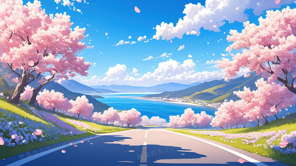 本作品内容为春天自然风景公路树花草海边插画, 格式为 jpg, 大小4 MB, 图片尺寸为2912 x 1632, 源文件无水印, 欢迎使用熊猫办公。 如认为平台内容涉嫌侵权,可通过邮件:tousu@tukuppt.com提出书面通知,我们将及时处理。