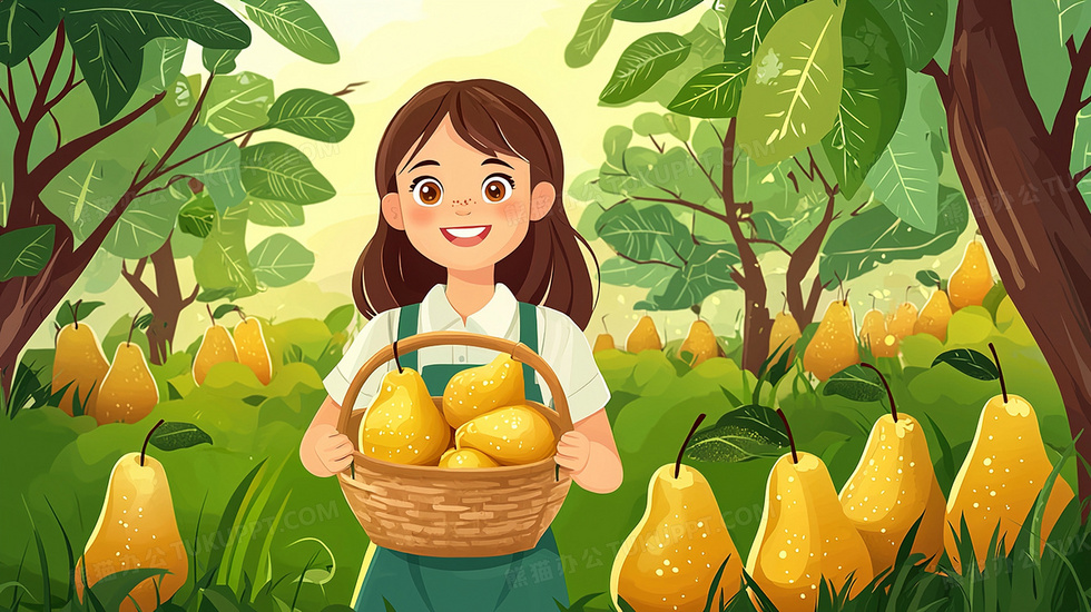 果园采摘水果雪梨卡通女孩插画