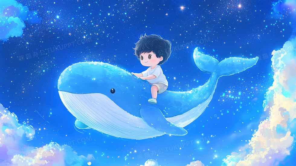 本作品内容为儿童绘本乘坐鲸鱼梦幻遨游太空可爱男孩插画, 格式为 jpg, 大小4 MB, 图片尺寸为2912 x 1632, 源文件无水印, 欢迎使用熊猫办公。 如认为平台内容涉嫌侵权,可通过邮件:tousu@tukuppt.com提出书面通知,我们将及时处理。