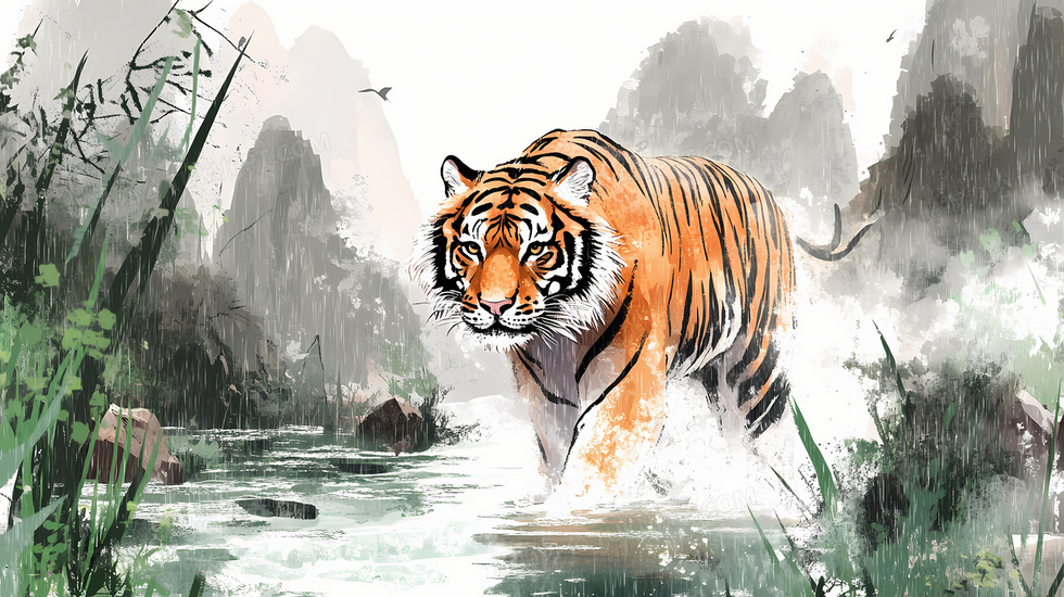 本作品内容为中国风水墨动物山中老虎插画, 格式为 jpg, 大小6 MB, 图片尺寸为2912 x 1632, 源文件无水印, 欢迎使用熊猫办公。 如认为平台内容涉嫌侵权,可通过邮件:tousu@tukuppt.com提出书面通知,我们将及时处理。