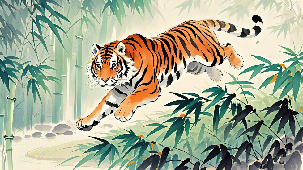 本作品内容为竹林老虎中国风水墨风插画, 格式为 jpg, 大小5 MB, 图片尺寸为3072 x 1728, 源文件无水印, 欢迎使用熊猫办公。 如认为平台内容涉嫌侵权,可通过邮件:tousu@tukuppt.com提出书面通知,我们将及时处理。