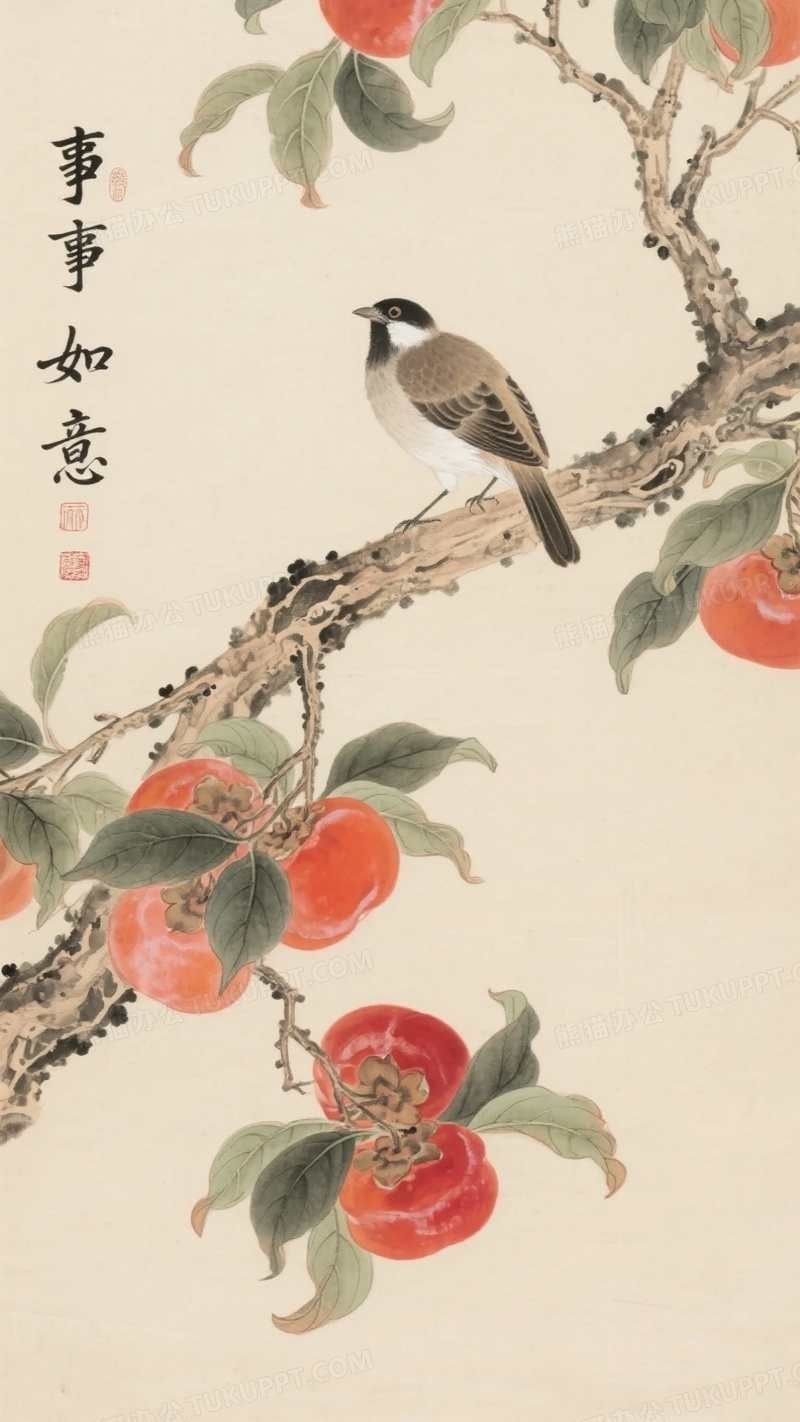 本作品内容为工笔画树枝上挂着红柿子和绿叶, 格式为 jpg, 大小1 MB, 图片尺寸为936 x 1664, 源文件无水印, 欢迎使用熊猫办公。 如认为平台内容涉嫌侵权,可通过邮件:tousu@tukuppt.com提出书面通知,我们将及时处理。