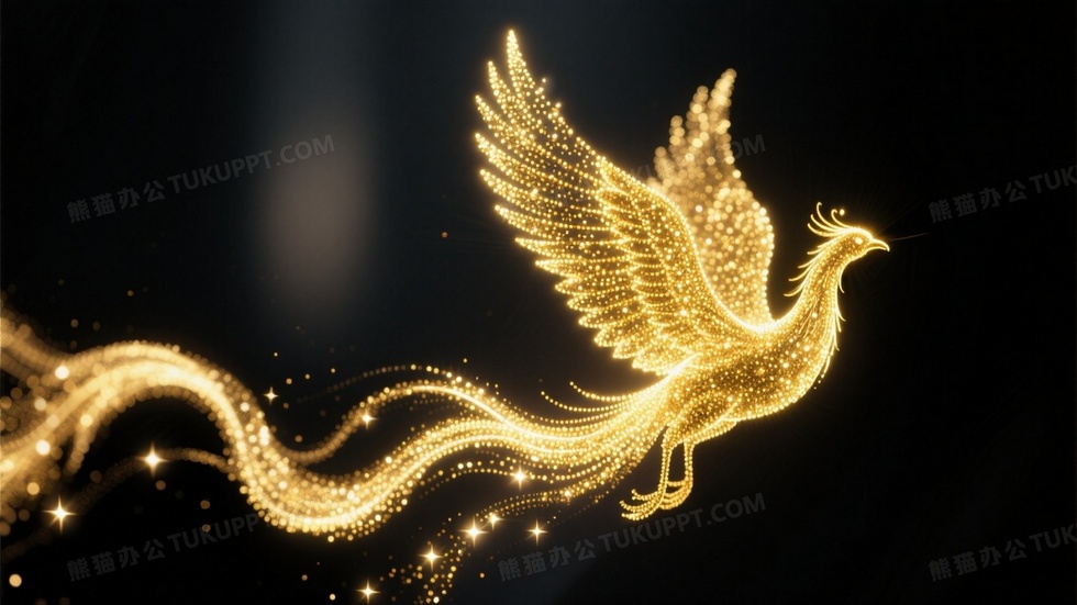 本作品内容为金色粒子凤凰展翅飞翔于纯黑背景, 格式为 jpg, 大小1 MB, 图片尺寸为1664 x 936, 作品中背景图片无需修改, 源文件无水印,可以直接使用, 欢迎使用熊猫办公。 如认为平台内容涉嫌侵权,可通过邮件:tousu@tukuppt.com提出书面通知,我们将及时处理。