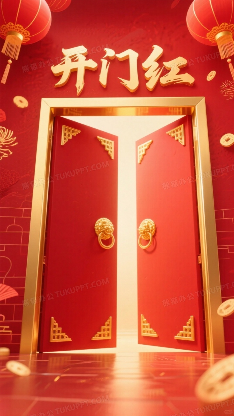 本作品内容为春节开门红主题插画巨大的红金色大门打开, 格式为 jpg, 大小1 MB, 图片尺寸为936 x 1664, 源文件无水印, 欢迎使用熊猫办公。 如认为平台内容涉嫌侵权,可通过邮件:tousu@tukuppt.com提出书面通知,我们将及时处理。