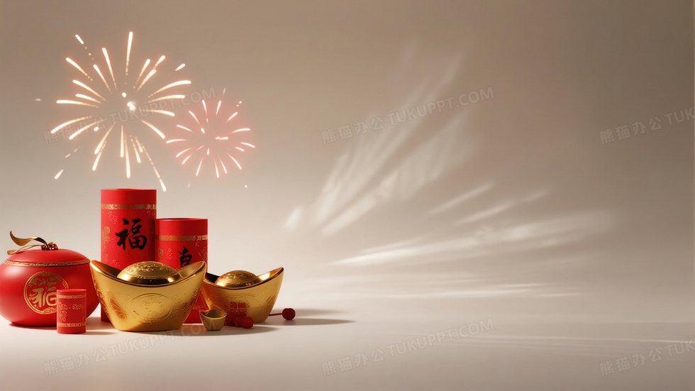 本作品内容为春节爆竹金元宝简约背景图, 格式为 jpg, 大小3 MB, 图片尺寸为3328 x 1872, 作品中背景图片无需修改, 源文件无水印,可以直接使用, 欢迎使用熊猫办公。 如认为平台内容涉嫌侵权,可通过邮件:tousu@tukuppt.com提出书面通知,我们将及时处理。