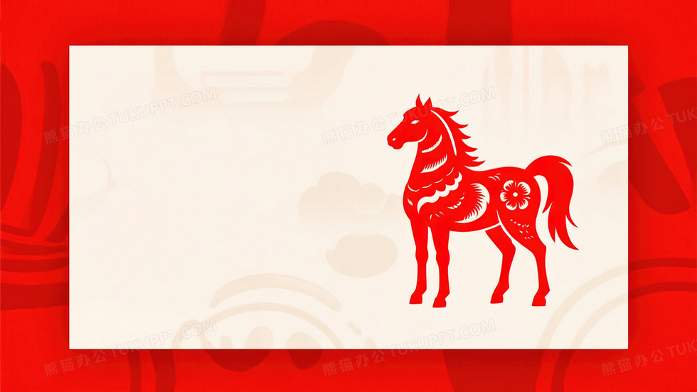 本作品内容为红色剪纸马年简约背景图, 格式为 jpg, 大小4 MB, 图片尺寸为3328 x 1872, 作品中背景图片无需修改, 源文件无水印,可以直接使用, 欢迎使用熊猫办公。 如认为平台内容涉嫌侵权,可通过邮件:tousu@tukuppt.com提出书面通知,我们将及时处理。