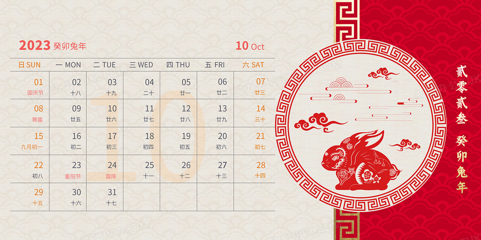 本作品内容为红色烫金兔年十月日历装饰素材, 格式为 psd, 大小54 MB, 图片尺寸为4724 x 2362, 作品中背景图片无需修改, 源文件无水印,可以直接使用, 欢迎使用熊猫办公。 如认为平台内容涉嫌侵权,可通过邮件:tousu@tukuppt.com提出书面通知,我们将及时处理。