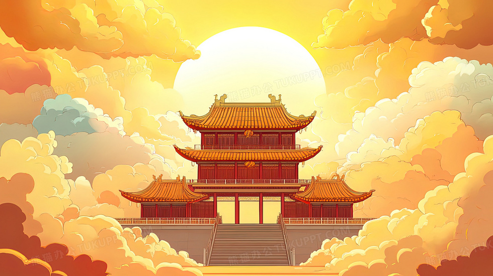 本作品内容为唯美云层日出中式建筑祥云插画, 格式为 jpg, 大小3 MB, 图片尺寸为2912 x 1632, 源文件无水印, 欢迎使用熊猫办公。 如认为平台内容涉嫌侵权,可通过邮件:tousu@tukuppt.com提出书面通知,我们将及时处理。