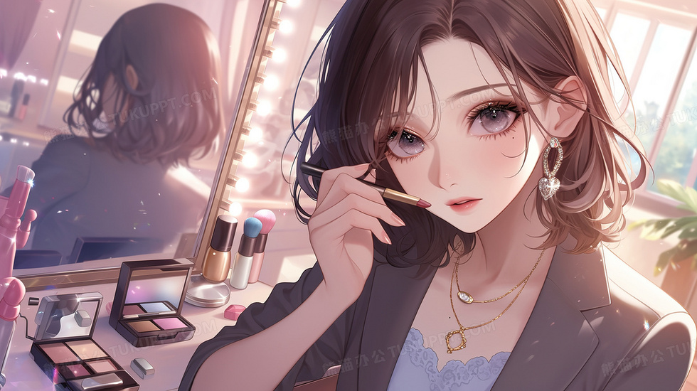 本作品内容为卡通女性化妆师正在桌前化妆插画, 格式为 jpg, 大小3 MB, 图片尺寸为2912 x 1632, 源文件无水印, 欢迎使用熊猫办公。 如认为平台内容涉嫌侵权,可通过邮件:tousu@tukuppt.com提出书面通知,我们将及时处理。