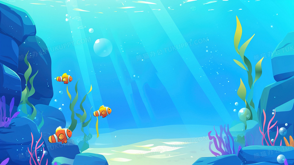 本作品内容为卡通海底世界海藻小鱼背景, 格式为 jpg, 大小2 MB, 图片尺寸为2912 x 1632, 作品中背景图片无需修改, 源文件无水印,可以直接使用, 欢迎使用熊猫办公。 如认为平台内容涉嫌侵权,可通过邮件:tousu@tukuppt.com提出书面通知,我们将及时处理。