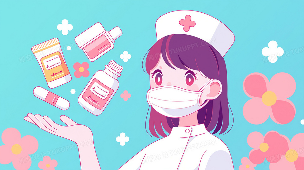 本作品内容为戴口罩女护士介绍药品插画, 格式为 jpg, 大小2 MB, 图片尺寸为2912 x 1632, 源文件无水印, 欢迎使用熊猫办公。 如认为平台内容涉嫌侵权,可通过邮件:tousu@tukuppt.com提出书面通知,我们将及时处理。