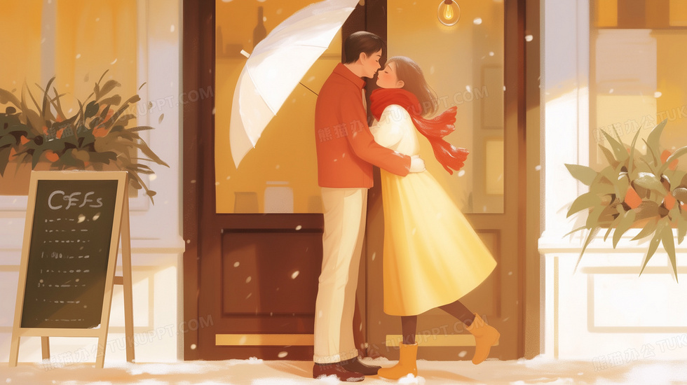 本作品内容为一对情侣从咖啡馆出来欣赏雪景插画, 格式为 jpg, 大小5 MB, 图片尺寸为2912 x 1632, 源文件无水印, 欢迎使用熊猫办公。 如认为平台内容涉嫌侵权,可通过邮件:tousu@tukuppt.com提出书面通知,我们将及时处理。