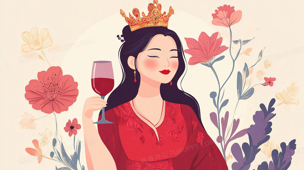 本作品内容为花丛中拿着红酒的自信美丽女性插画, 格式为 jpg, 大小2 MB, 图片尺寸为2912 x 1632, 源文件无水印, 欢迎使用熊猫办公。 如认为平台内容涉嫌侵权,可通过邮件:tousu@tukuppt.com提出书面通知,我们将及时处理。