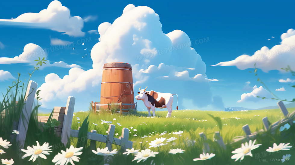 本作品内容为奶牛站在刚挤出来的奶桶旁边吃草厚涂场景插画, 格式为 jpg, 大小4 MB, 图片尺寸为2912 x 1632, 源文件无水印, 欢迎使用熊猫办公。 如认为平台内容涉嫌侵权,可通过邮件:tousu@tukuppt.com提出书面通知,我们将及时处理。