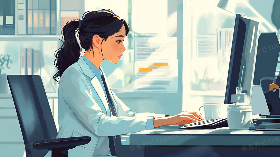 本作品内容为一个正在办公的女白领插画, 格式为 jpg, 大小1 MB, 图片尺寸为2912 x 1632, 源文件无水印, 欢迎使用熊猫办公。 如认为平台内容涉嫌侵权,可通过邮件:tousu@tukuppt.com提出书面通知,我们将及时处理。