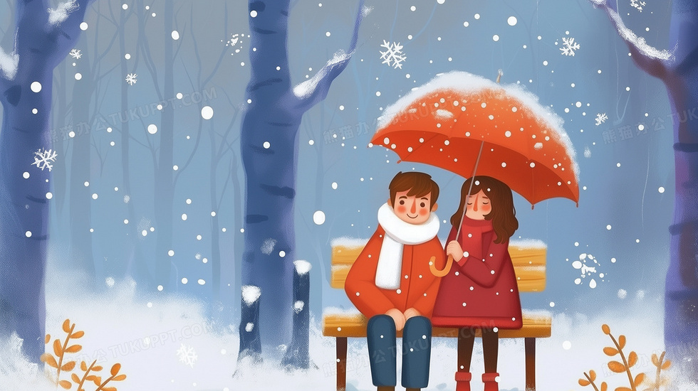 本作品内容为冬日森林中一对情侣举着伞坐在长椅上赏雪插画, 格式为 jpg, 大小6 MB, 图片尺寸为2912 x 1632, 源文件无水印, 欢迎使用熊猫办公。 如认为平台内容涉嫌侵权,可通过邮件:tousu@tukuppt.com提出书面通知,我们将及时处理。