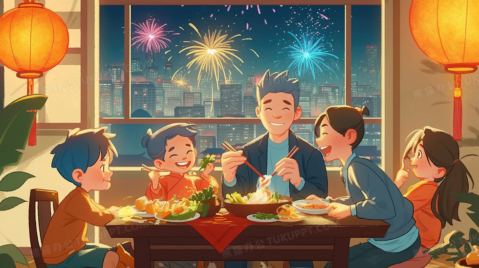 本作品内容为新年窗外放烟花吃年夜饭的一家人温馨插画, 格式为 jpg, 大小3 MB, 图片尺寸为2912 x 1632, 源文件无水印, 欢迎使用熊猫办公。 如认为平台内容涉嫌侵权,可通过邮件:tousu@tukuppt.com提出书面通知,我们将及时处理。