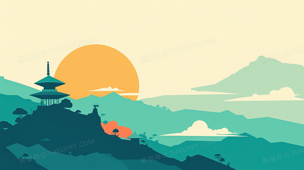 本作品内容为卡通山水日出景色创意背景, 格式为 jpg, 大小2 MB, 图片尺寸为2912 x 1632, 作品中背景图片无需修改, 源文件无水印,可以直接使用, 欢迎使用熊猫办公。 如认为平台内容涉嫌侵权,可通过邮件:tousu@tukuppt.com提出书面通知,我们将及时处理。