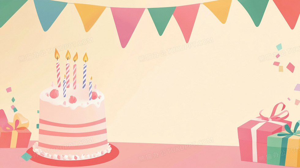 本作品内容为彩旗生日蛋糕甜品派对背景, 格式为 jpg, 大小2 MB, 图片尺寸为2912 x 1632, 作品中背景图片无需修改, 源文件无水印,可以直接使用, 欢迎使用熊猫办公。 如认为平台内容涉嫌侵权,可通过邮件:tousu@tukuppt.com提出书面通知,我们将及时处理。