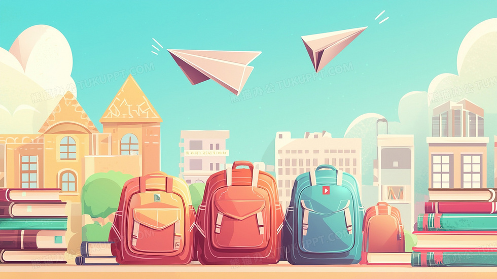 本作品内容为蓝天白云城市建筑纸飞机书包插画, 格式为 jpg, 大小2 MB, 图片尺寸为2912 x 1632, 源文件无水印, 欢迎使用熊猫办公。 如认为平台内容涉嫌侵权,可通过邮件:tousu@tukuppt.com提出书面通知,我们将及时处理。