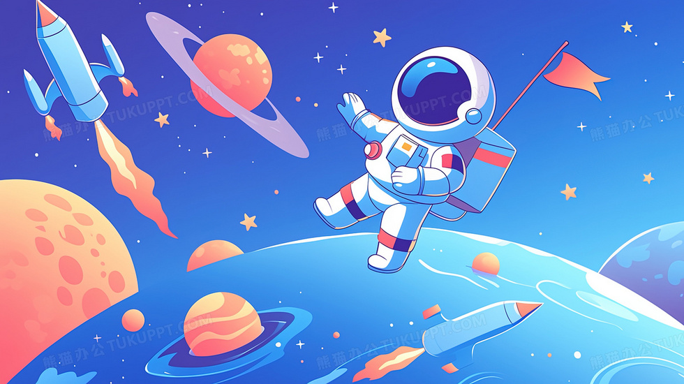 本作品内容为蓝色卡通太空遨游的宇航员插画, 格式为 jpg, 大小2 MB, 图片尺寸为2912 x 1632, 源文件无水印, 欢迎使用熊猫办公。 如认为平台内容涉嫌侵权,可通过邮件:tousu@tukuppt.com提出书面通知,我们将及时处理。