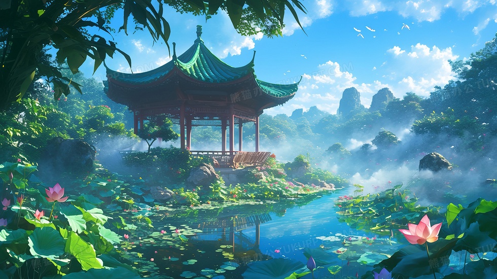 本作品内容为荷花池塘边的古亭中式建筑景观插画, 格式为 jpg, 大小4 MB, 图片尺寸为2912 x 1632, 源文件无水印, 欢迎使用熊猫办公。 如认为平台内容涉嫌侵权,可通过邮件:tousu@tukuppt.com提出书面通知,我们将及时处理。
