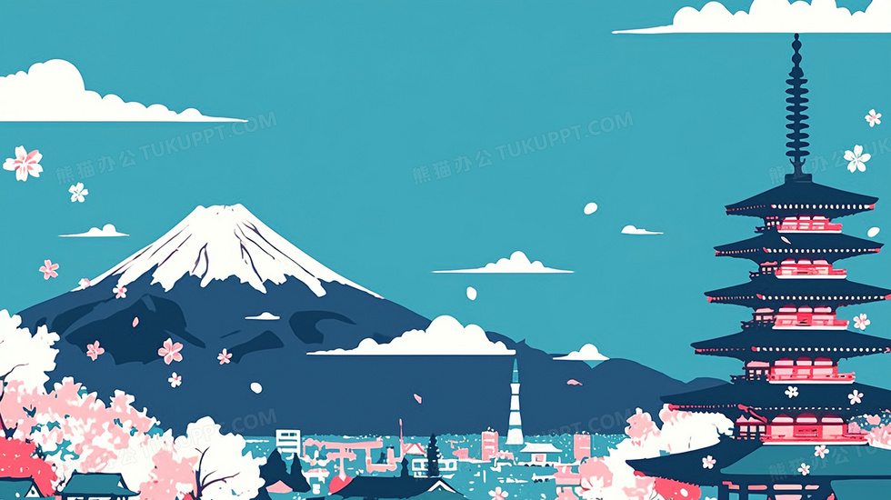 本作品内容为卡通日本富士山建筑景色背景, 格式为 jpg, 大小2 MB, 图片尺寸为2912 x 1632, 作品中背景图片无需修改, 源文件无水印,可以直接使用, 欢迎使用熊猫办公。 如认为平台内容涉嫌侵权,可通过邮件:tousu@tukuppt.com提出书面通知,我们将及时处理。