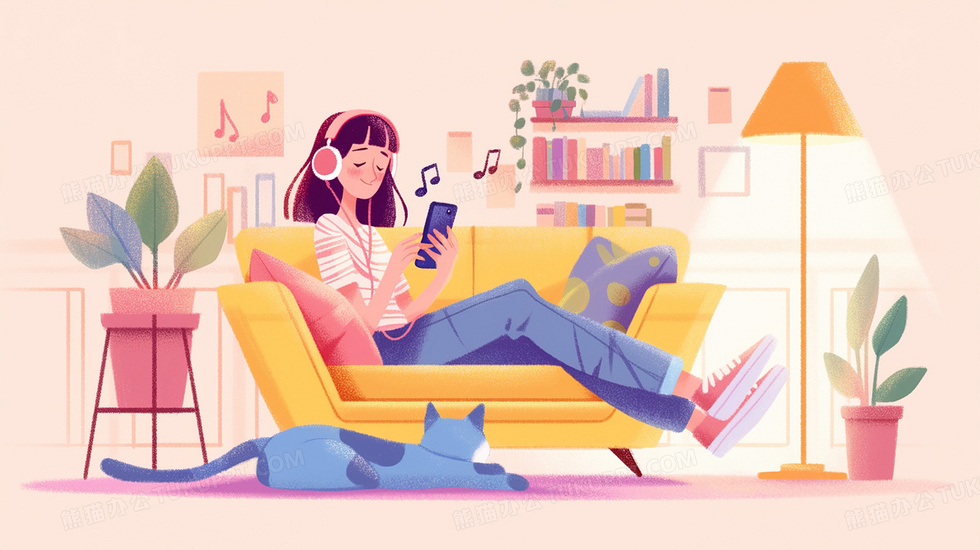 本作品内容为坐沙发手机听音乐的女孩和宠物猫插画, 格式为 jpg, 大小2 MB, 图片尺寸为2912 x 1632, 源文件无水印, 欢迎使用熊猫办公。 如认为平台内容涉嫌侵权,可通过邮件:tousu@tukuppt.com提出书面通知,我们将及时处理。