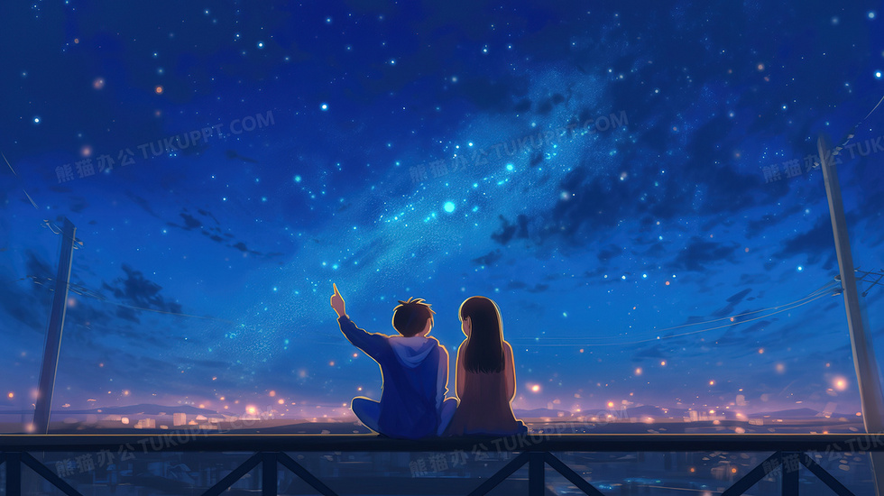 本作品内容为男孩女孩坐天台看唯美星空插画, 格式为 jpg, 大小3 MB, 图片尺寸为2912 x 1632, 源文件无水印, 欢迎使用熊猫办公。 如认为平台内容涉嫌侵权,可通过邮件:tousu@tukuppt.com提出书面通知,我们将及时处理。