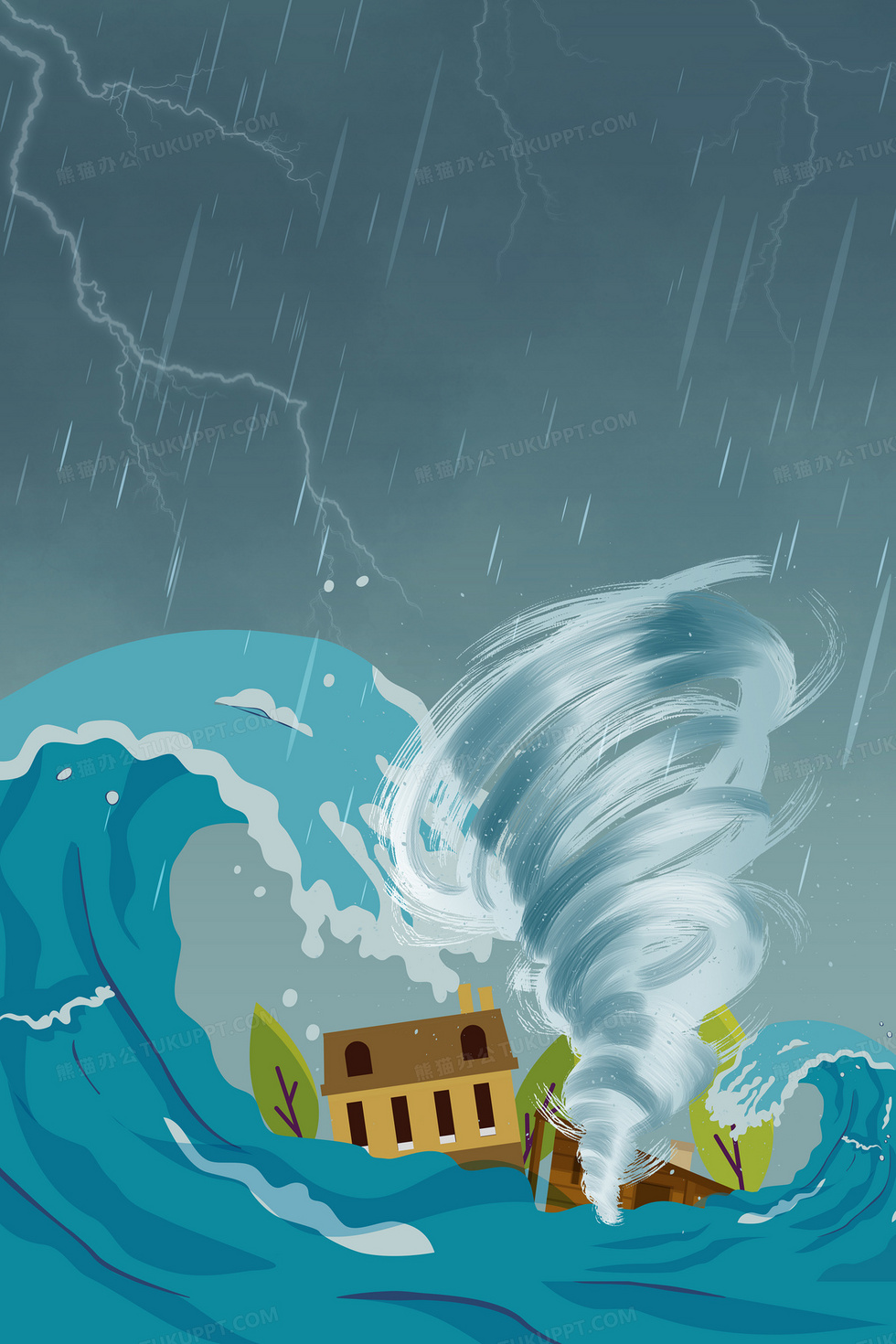 本作品内容为沿海城市遭遇台风来袭背景, 格式为 psd, 大小36 MB, 图片尺寸为3543 x 5315, 作品中背景图片无需修改, 源文件无水印,可以直接使用, 欢迎使用熊猫办公。 如认为平台内容涉嫌侵权,可通过邮件:tousu@tukuppt.com提出书面通知,我们将及时处理。