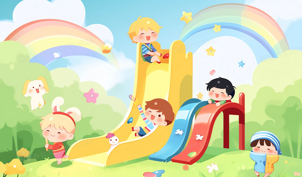 本作品内容为卡通风小朋友们在游乐园玩滑梯插图, 格式为 jpg, 大小2 MB, 图片尺寸为2688 x 1576, 源文件无水印, 欢迎使用熊猫办公。 如认为平台内容涉嫌侵权,可通过邮件:tousu@tukuppt.com提出书面通知,我们将及时处理。