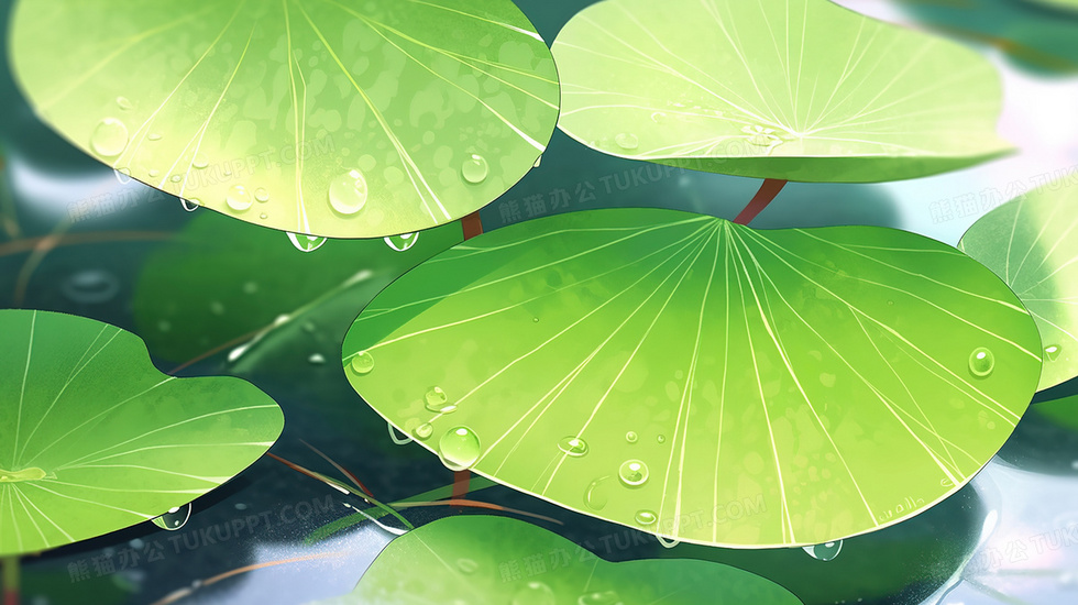 本作品内容为春天下雨天里的绿色荷叶插画, 格式为 jpg, 大小3 MB, 图片尺寸为2912 x 1632, 源文件无水印, 欢迎使用熊猫办公。 如认为平台内容涉嫌侵权,可通过邮件:tousu@tukuppt.com提出书面通知,我们将及时处理。