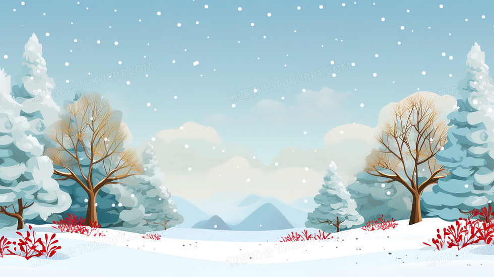 本作品内容为冬季下雪中的雪地森林插画, 格式为 jpg, 大小5 MB, 图片尺寸为2912 x 1632, 源文件无水印, 欢迎使用熊猫办公。 如认为平台内容涉嫌侵权,可通过邮件:tousu@tukuppt.com提出书面通知,我们将及时处理。