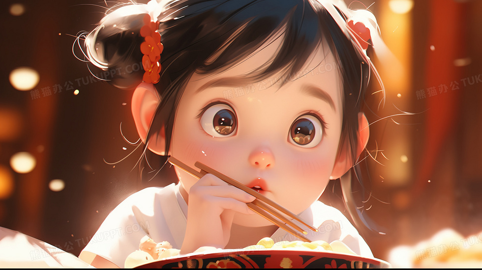 本作品内容为一个可爱的中国小女孩吃饭插画, 格式为 jpg, 大小5 MB, 图片尺寸为2912 x 1632, 源文件无水印, 欢迎使用熊猫办公。 如认为平台内容涉嫌侵权,可通过邮件:tousu@tukuppt.com提出书面通知,我们将及时处理。