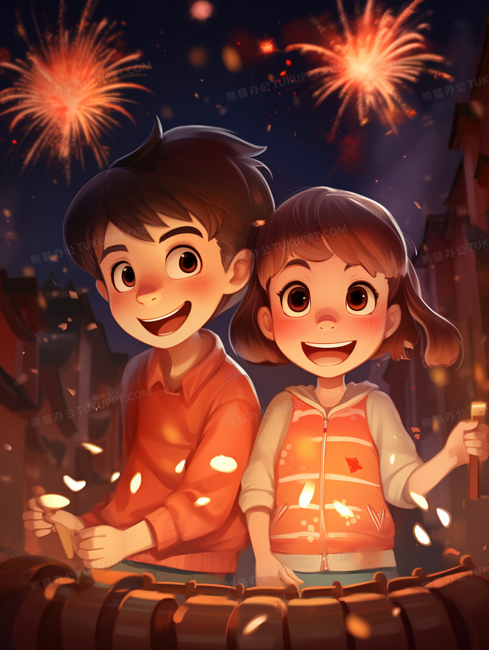 本作品内容为放烟花的卡通人物春节节气插画, 格式为 jpg, 大小4 MB, 图片尺寸为1856 x 2464, 源文件无水印, 欢迎使用熊猫办公。 如认为平台内容涉嫌侵权,可通过邮件:tousu@tukuppt.com提出书面通知,我们将及时处理。
