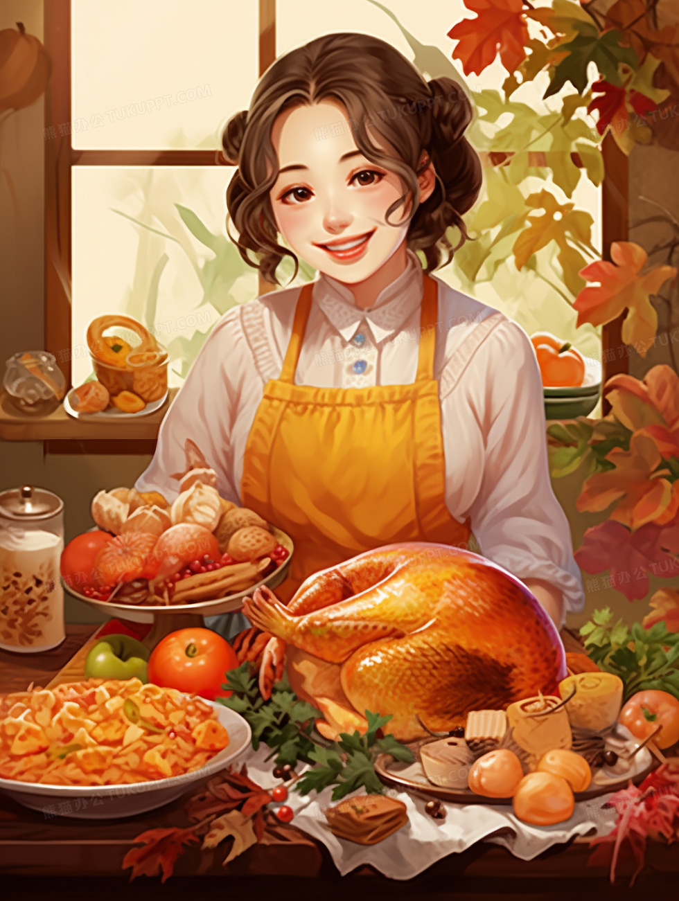 本作品内容为感恩节女孩烤鸡美食插画, 格式为 jpg, 大小5 MB, 图片尺寸为1760 x 2336, 源文件无水印, 欢迎使用熊猫办公。 如认为平台内容涉嫌侵权,可通过邮件:tousu@tukuppt.com提出书面通知,我们将及时处理。