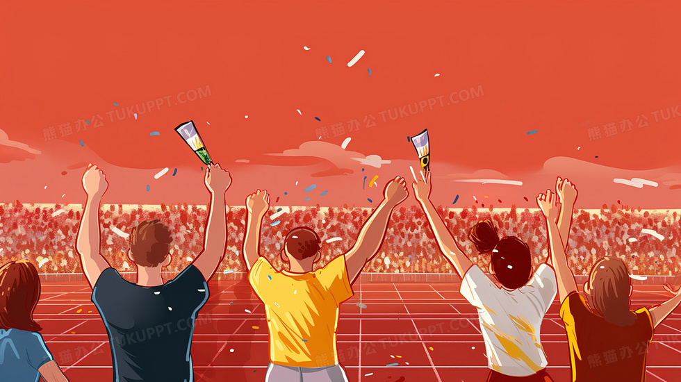 本作品内容为赛场上观众们欢呼庆祝的背影插画, 格式为 jpg, 大小5 MB, 图片尺寸为2912 x 1632, 源文件无水印, 欢迎使用熊猫办公。 如认为平台内容涉嫌侵权,可通过邮件:tousu@tukuppt.com提出书面通知,我们将及时处理。