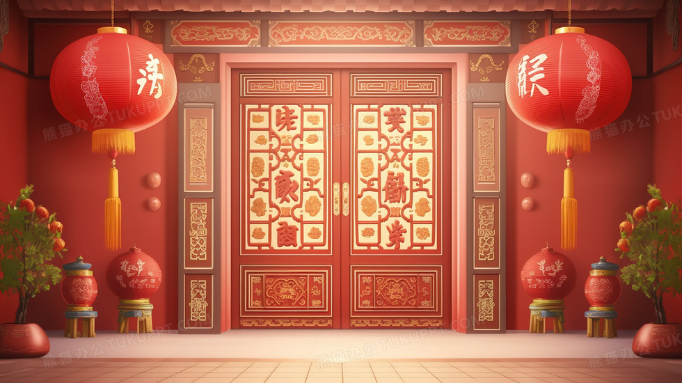 本作品内容为中国古代建筑古典红色大门插画, 格式为 jpg, 大小5 MB, 图片尺寸为2912 x 1632, 源文件无水印, 欢迎使用熊猫办公。 如认为平台内容涉嫌侵权,可通过邮件:tousu@tukuppt.com提出书面通知,我们将及时处理。