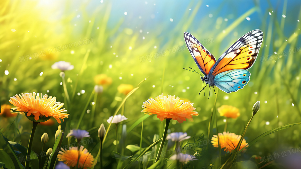 本作品内容为春天鲜花丛中飞舞的蝴蝶插画, 格式为 jpg, 大小5 MB, 图片尺寸为2912 x 1632, 源文件无水印, 欢迎使用熊猫办公。 如认为平台内容涉嫌侵权,可通过邮件:tousu@tukuppt.com提出书面通知,我们将及时处理。