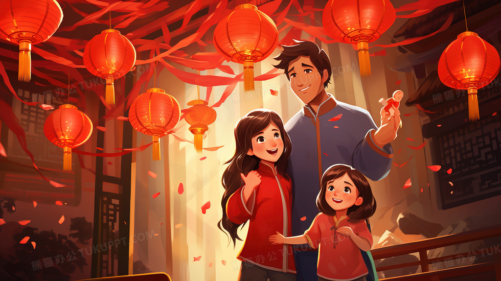 本作品内容为庆祝新年里温馨的一家三口插画, 格式为 jpg, 大小6 MB, 图片尺寸为2912 x 1632, 源文件无水印, 欢迎使用熊猫办公。 如认为平台内容涉嫌侵权,可通过邮件:tousu@tukuppt.com提出书面通知,我们将及时处理。