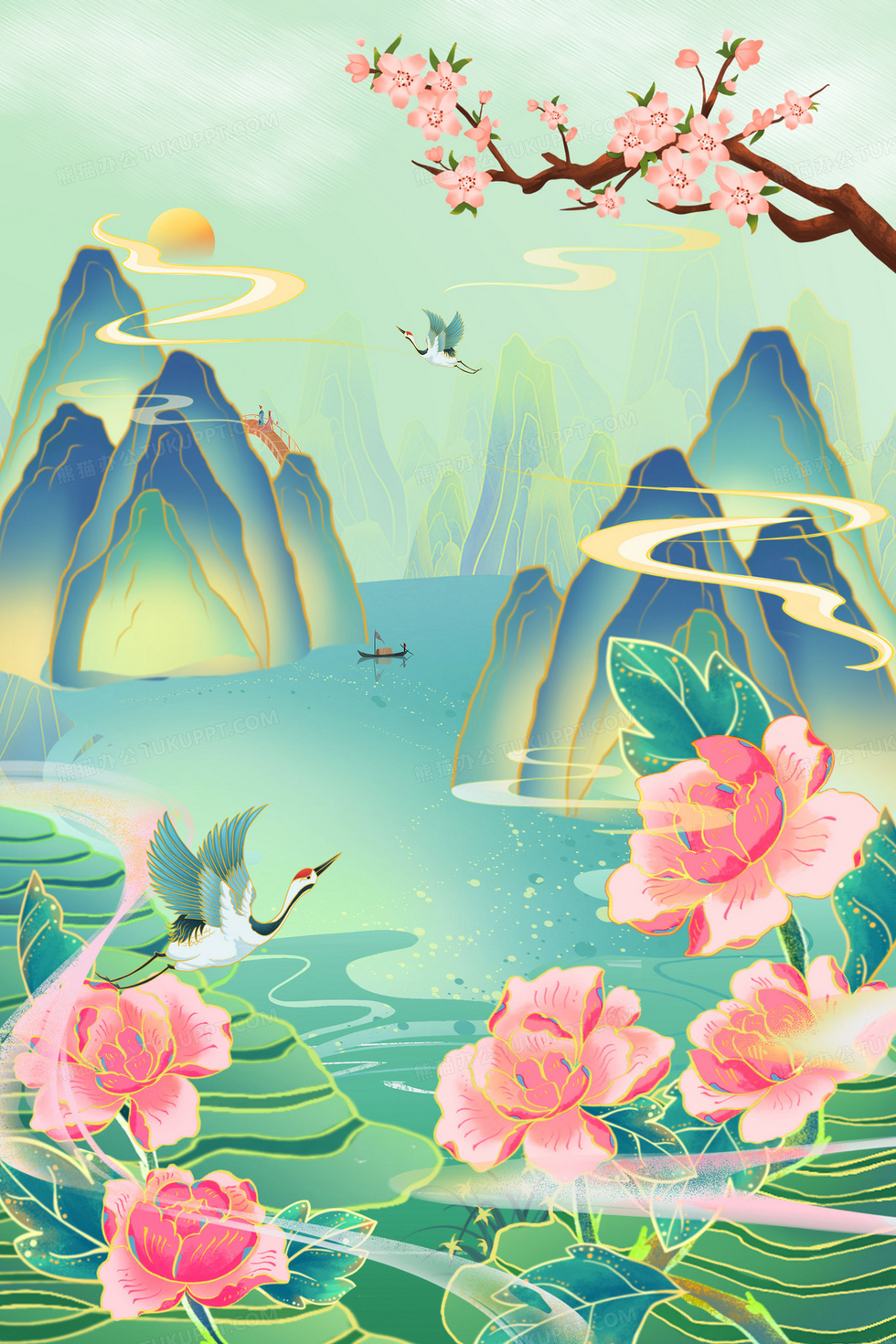 本作品内容为国潮牡丹山水仙鹤背景, 格式为 psd, 大小77 MB, 图片尺寸为3543 x 5314, 作品中背景图片无需修改, 源文件无水印,可以直接使用, 欢迎使用熊猫办公。 如认为平台内容涉嫌侵权,可通过邮件:tousu@tukuppt.com提出书面通知,我们将及时处理。