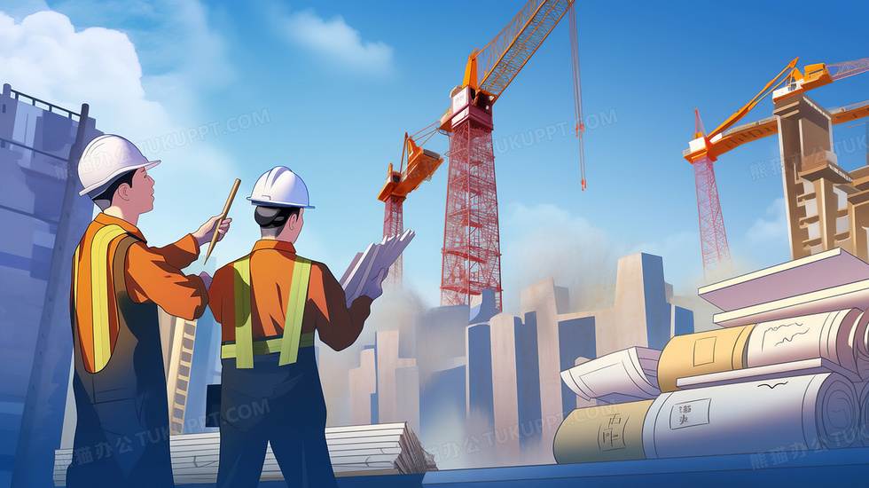 本作品内容为2个戴着安全头盔穿着专业的工程师在建筑工地监督施工情况创意插画, 格式为 jpg, 大小3 MB, 图片尺寸为2912 x 1632, 源文件无水印, 欢迎使用熊猫办公。 如认为平台内容涉嫌侵权,可通过邮件:tousu@tukuppt.com提出书面通知,我们将及时处理。