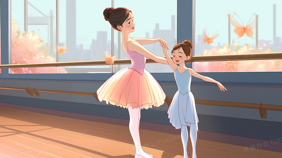 本作品内容为舞蹈教室里老师带着学生练习芭蕾舞创意插画, 格式为 jpg, 大小2 MB, 图片尺寸为2912 x 1632, 源文件无水印, 欢迎使用熊猫办公。 如认为平台内容涉嫌侵权,可通过邮件:tousu@tukuppt.com提出书面通知,我们将及时处理。