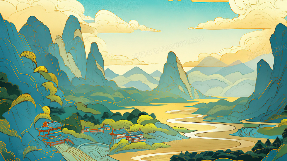 本作品内容为创意国潮中国风山水风景画, 格式为 jpg, 大小8 MB, 图片尺寸为2912 x 1632, 源文件无水印, 欢迎使用熊猫办公。 如认为平台内容涉嫌侵权,可通过邮件:tousu@tukuppt.com提出书面通知,我们将及时处理。
